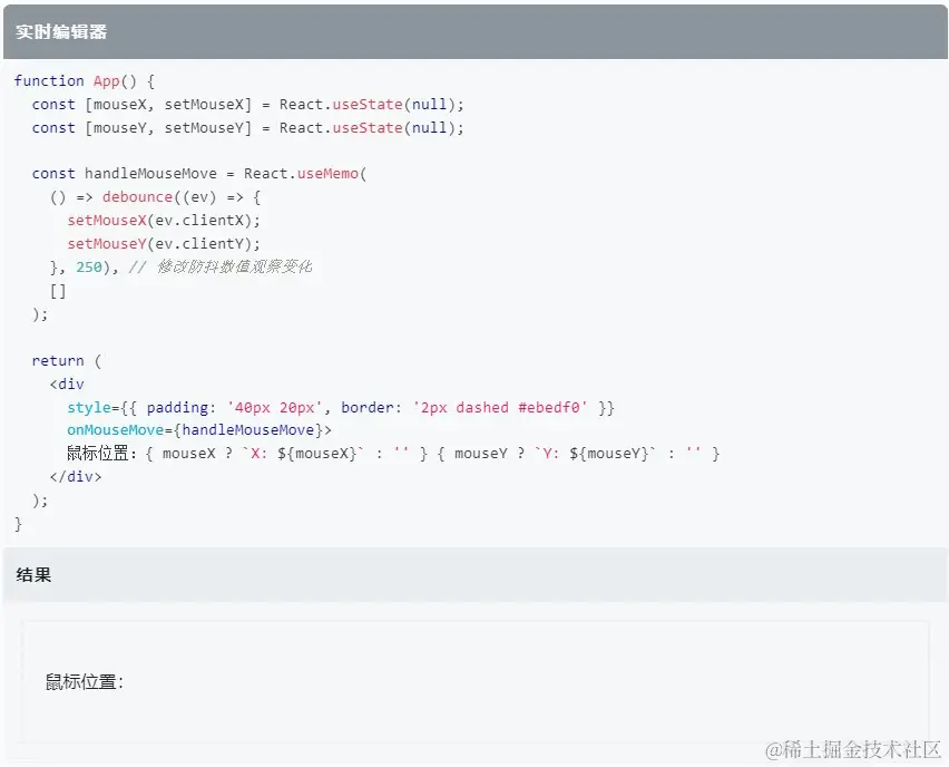 修改代码块中防抖函数中的数值来观察结果区文字变化的响应速度