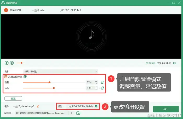 步骤2:录好的音频怎么去除杂音?勾选**【开启音频降噪】**模式,软件会自动识别并分析音频中的噪声,并进行相应的降噪处理。我们还可以调整音量、延迟数值。另外,点击输出设置,可以进行更改。