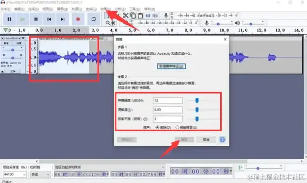 步骤3:此时,软件会自动分析选择的音频片段中的噪声,并生成一个噪声频谱图。根据需要调整降噪级别、频率、灵敏度等参数。