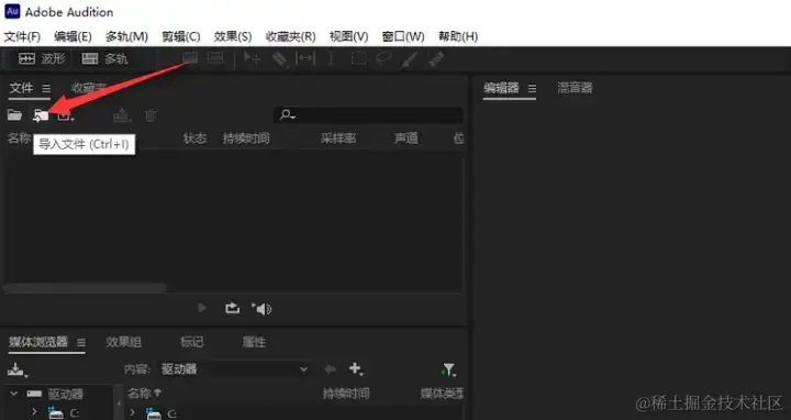 步骤1:打开电脑,下载Adobe Audition音频降噪处理软件,点击**【文件】**按钮导入音频片段。