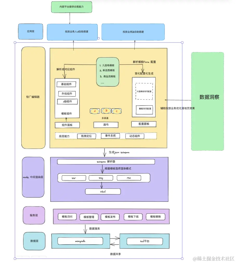 整体的架构包含应用层、B端编辑器SDK、C端Node渲染层、以及基于nest.js数据服务存储层。