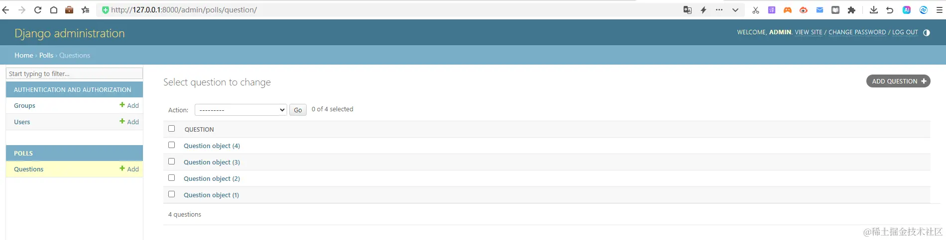 我们便注册好了 question 类。在我们刚刚打开的管理界面,就看到了注册好的question应用。