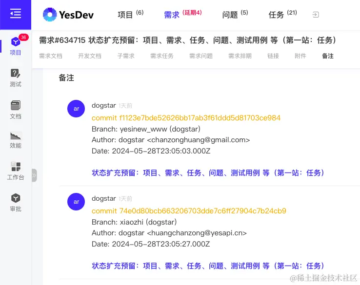 记录的好处,有利于查漏补缺,也方便后面的测试回归。最好是把git代码提交也和需求进行关联。YesDev支持各类Git代码仓库的自动关联。