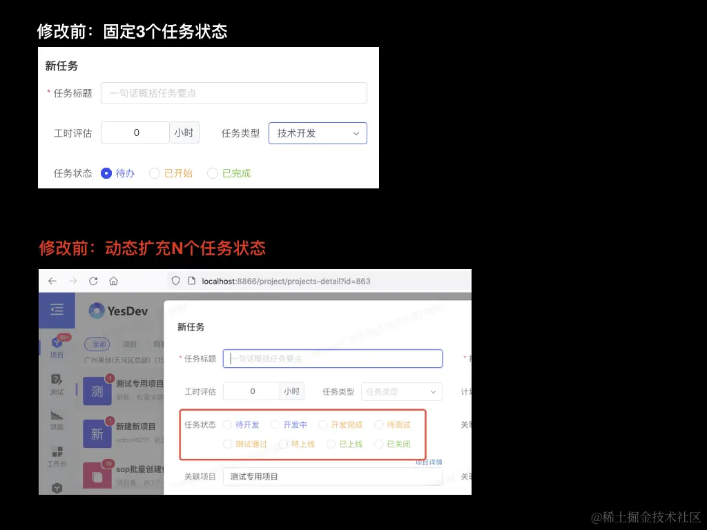 最近我们YesDev项目管理平台收到了一个客户的需求,希望能把YesDev原来任务只有固定的3个任务状态(待办、进行中、已完成),动态扩充到任意多个任务状态(例如:期望流程:待开发 -> 开发中 -> 开发完成 -> 待测试 -> 测试通过 -> 待上线 -> 已上线 -> 已关闭)。