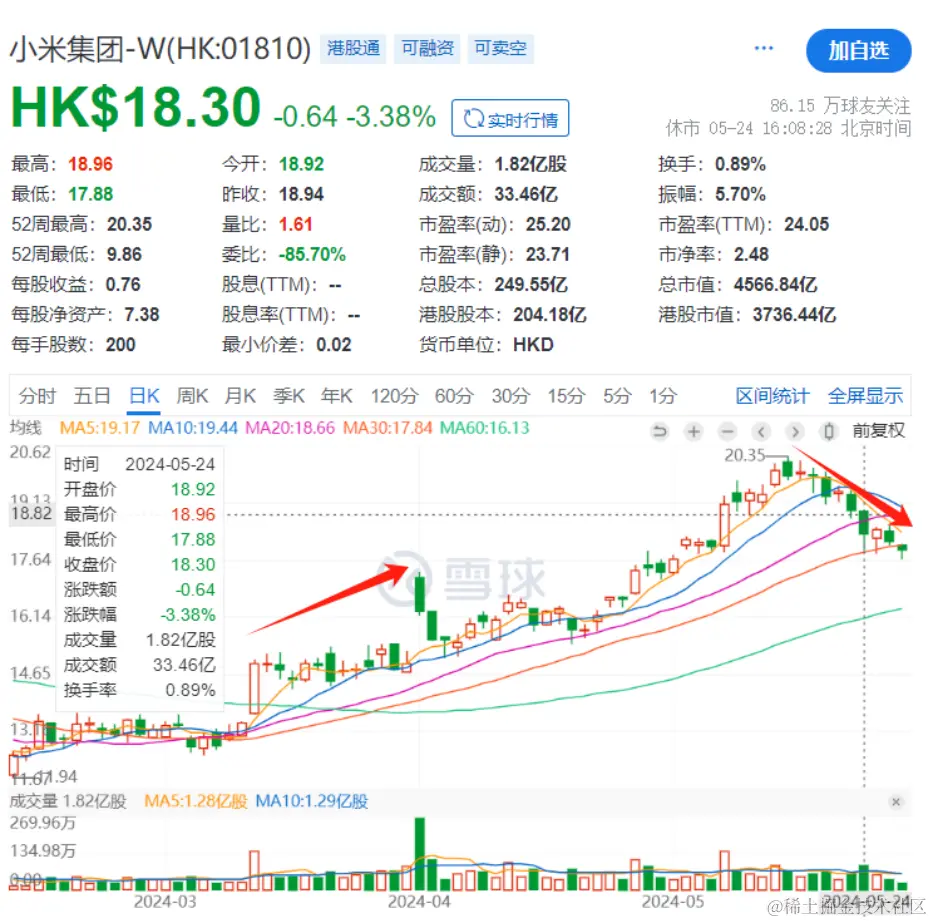 财报后,小米股价累跌7.32%,29日的收盘价为18.3港元/股,市值4566.84亿港元。