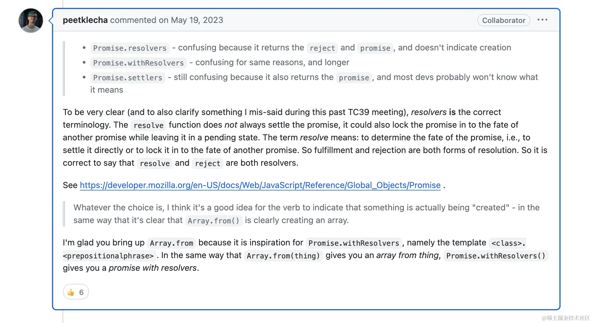 此外,ECMAScript 规范将 resolve 和 reject 命名为 "resolving functions"。