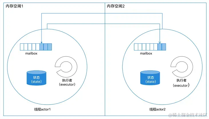 CSP(Communicating Sequential Processes,通信顺序进程)中的计算单元并不能直接互相发送信息。需要通过通道(Channel)作为媒介进行消息传递:发送方需要将消息发送到Channel,而接收方需要从Channel读取消息。与CSP不同,在Actor模型中,每个Actor可以看做一个独立的计算单元,并且相互之间内存隔离,每个Actor中存在信箱(Mail Box),Actor之间可以直接进行消息传递,如下图所示: