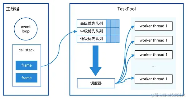 相比使用Worker实现多线程并发,TaskPool更加易于使用,创建开销也少于Worker,并且Worker线程有个数限制,需要开发者自己掌握,TaskPool的基本概念可参见 TaskPool和Worker的对比 。TaskPool作用是为应用程序提供一个多线程的运行环境。TaskPool在Worker之上实现了调度器和Worker线程池,TaskPool根据任务的优先级,将其放入不同的优先级队列,调度器会依据自己实现的调度算法(优先级,防饥饿),从优先级队列中取出任务,放入TaskPool中的Worker线程池,执行相关任务,流程图如下所示: