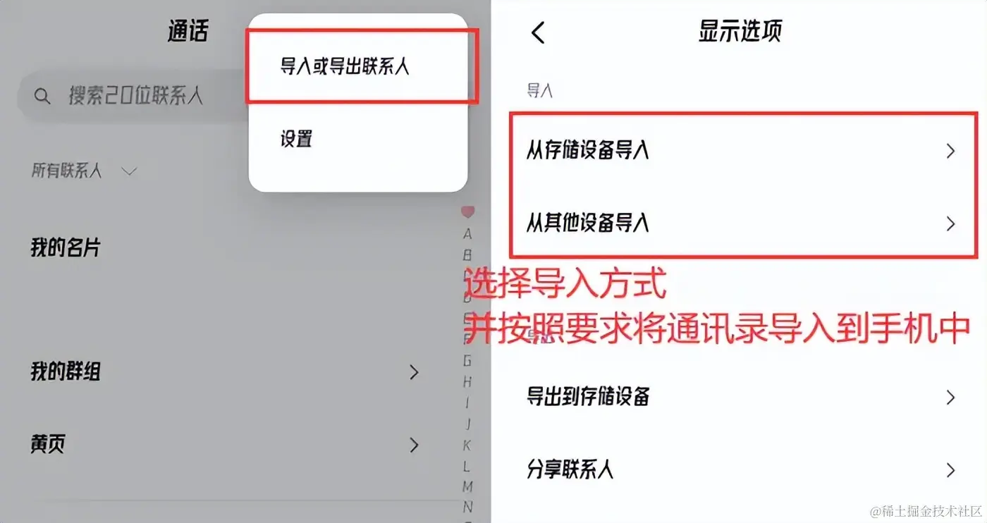 第二步:同样是在手机通讯录中,找到 【导入或导出联系人】 ,我们就可以使用手上的其他设备或手机卡重新将联系人恢复到手机中了!