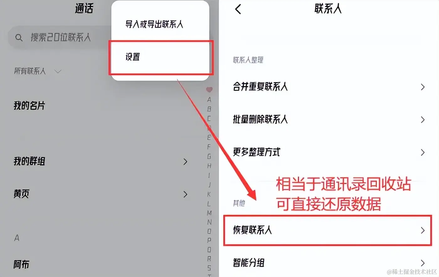 第一步:打开手机通讯录,在右上角点击打开 【设置】 ,进入后找到 【恢复联系人】 选项,然后查找需要恢复的联系人点击还原即可。