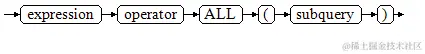 右边是一个圆括弧括起来的子查询,它必须只返回一个字段。左边表达式使用operator对子查询结果的每一行进行一次计算和比较,其结果必须是布尔值。如果全部获得真值,ALL结果为"真"(包括子查询没有返回任何行的情况)。如果至少获得一个假值,则结果是"假"。