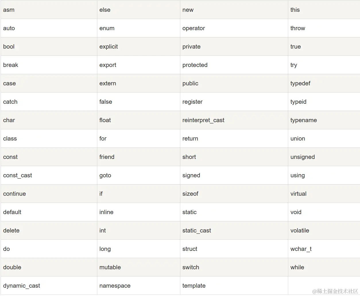 下表列出了 C++ 中的保留字。这些保留字不能作为常量名、变量名或其他标识符名称。