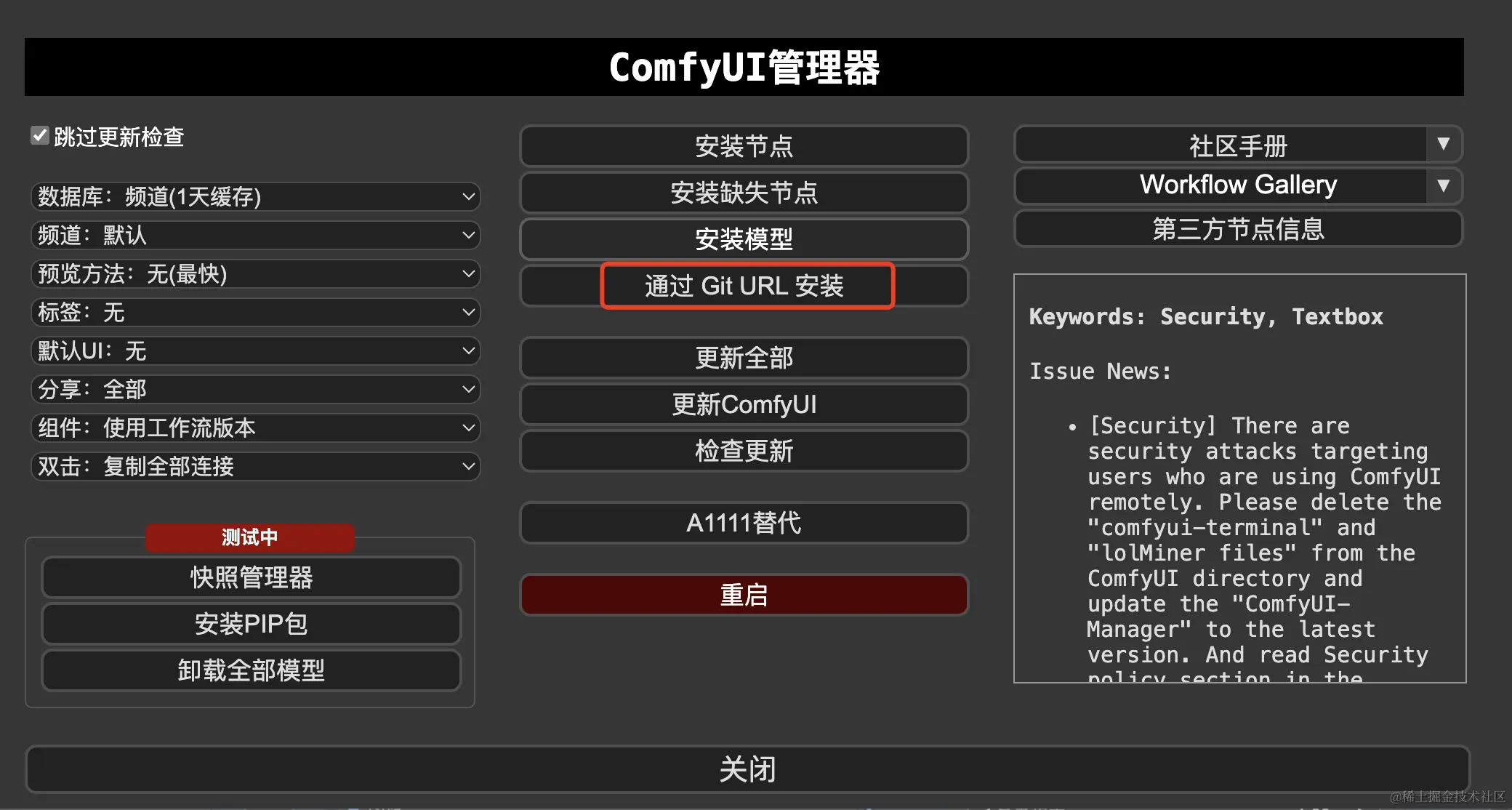 安装成功后,不要忘了重启ComfyUI,刷新浏览器页面。