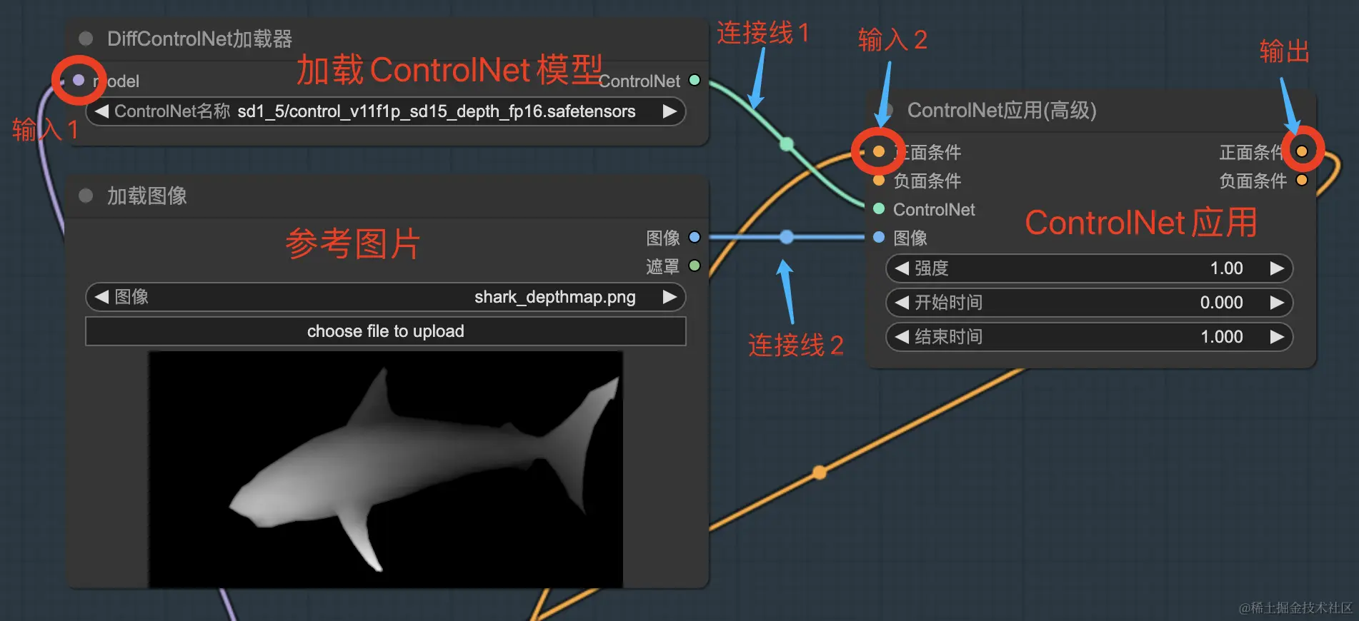 我们可以认为“DiffControlNet加载器”和“加载图像”都是为“ControlNet应用”提供必需参数的,上图中的“连接线1”和“连接线2”就起到提供参数的作用。