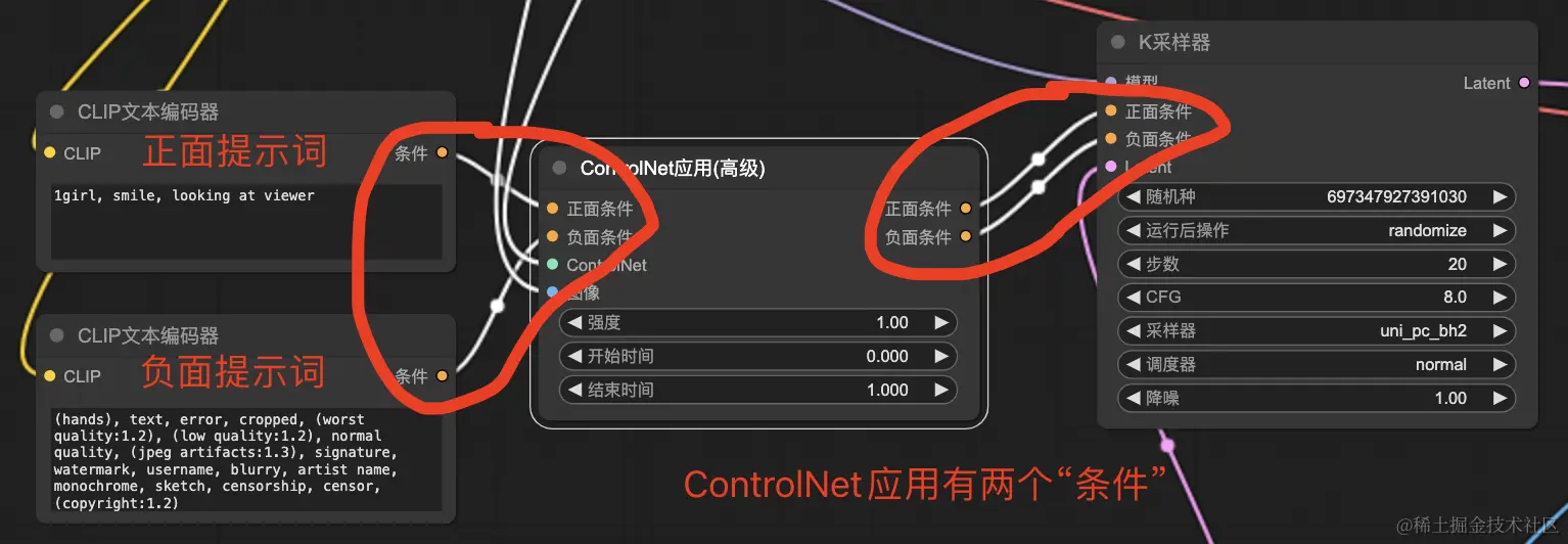 下图是“ControlNet应用(高级)”有两个条件参数的连接线示例: