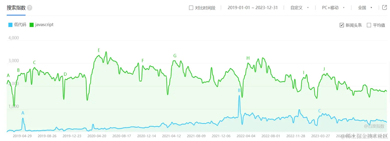 (”低代码“一词的搜索指数与JavaScript相比较)