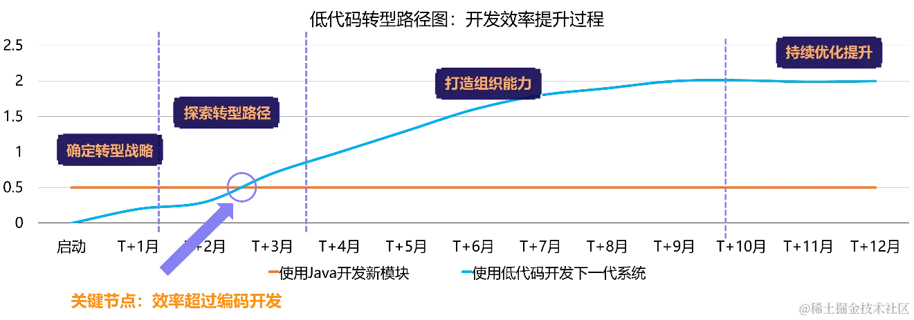 特别提醒的是,低代码转型的效果是逐步呈现的,而不是一蹴而就,我们需要对此保持合理的期望和耐心。下图展示了低代码转型过程中,代码开发与低代码开发的典型效率对比。其中,横轴表示时间,纵轴表示开发效率的提升。橙色的线是以 Java 开发的平均效率作为参考,蓝色的线则代表使用低代码开发的效率变化过程。从图中可以看出,在转型的初始阶段,因为团队的不熟练,低代码开发的效率可能会低于代码开发方式。但随着转型的推进,进入探索期之后,低代码开发的效率将会赶上并超越传统开发模式。当转型进行第三阶段时,低代码的开发效率将大幅领先传统开发模式,这才是低代码技术的实际价值体现。