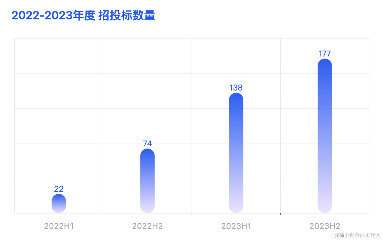 企业对低代码技术的实际需求验证了专业机构的预测。我们分析了国内中大型组织在招标中提出对“低代码技术”的需求,根据国内五家重点招投标网站上发布的信息,从 2022 年到 2023 年共有 411 条(去重后)与低代码相关的招投标记录,金额普遍在 50 万以上,仅仅这些企业在低代码上的投资就已经达到了数亿元规模。同时,从时间维度看,低代码需求呈现显著的增长趋势,从 2022 年上半年到 2023 年下半年,招投标的数量增长了 8 倍。