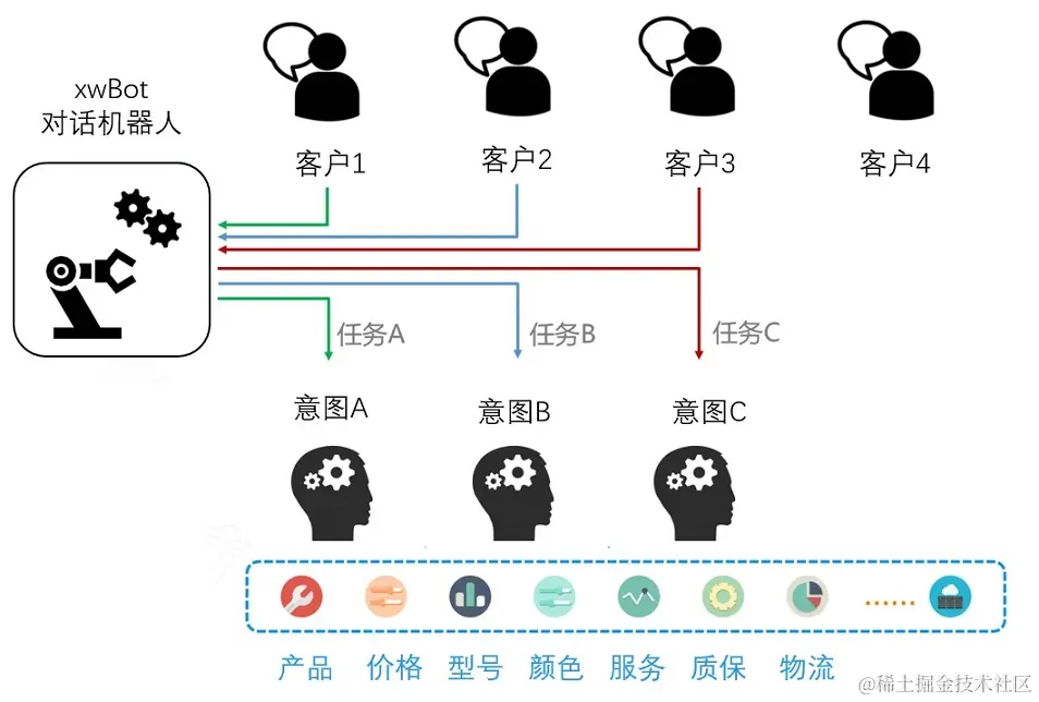 聊天的核心是基于AI大模型的对话能力,不同职位的招聘要求是不一样的,通过预设prompt,提供前置信息输入到大模型。协同关系类似下图,客户类比求职者,不同的意图代表不同的岗位要求,通过系统的意图预设,大模型提供能力基座,实现不同职位不同对话机器人。