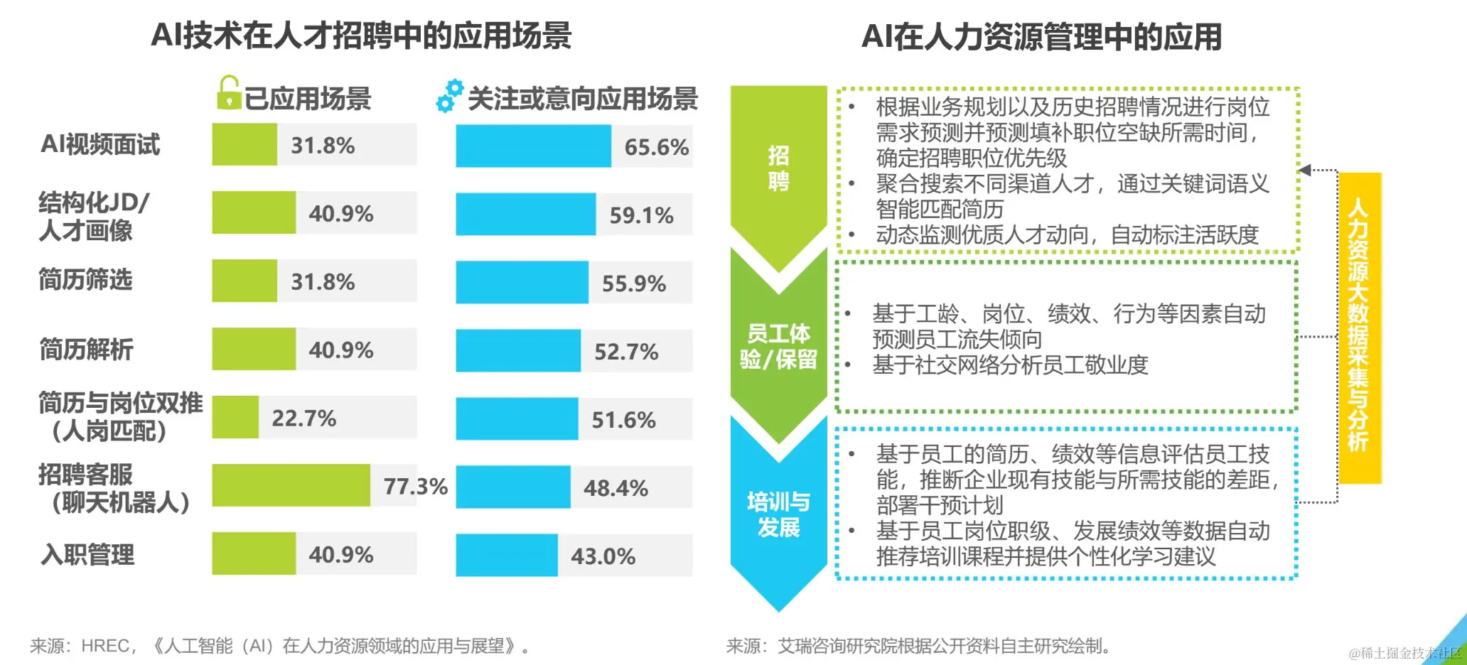 Al现已应用于人力资源管理从招聘到员工体验到员工培训与发展的各个环节中,人工智能在人才招聘上的应用场景主要包括简历 解析与筛选、人岗匹配、招聘客服(聊天机器人) 等。根据艾瑞咨询关于中国网络招聘市场发展研究报告,不难发现,AI在招聘领域的不同环节,重塑了整个流程的职能分工,进一步解放人力资本,将这个市场推向另一个高度。