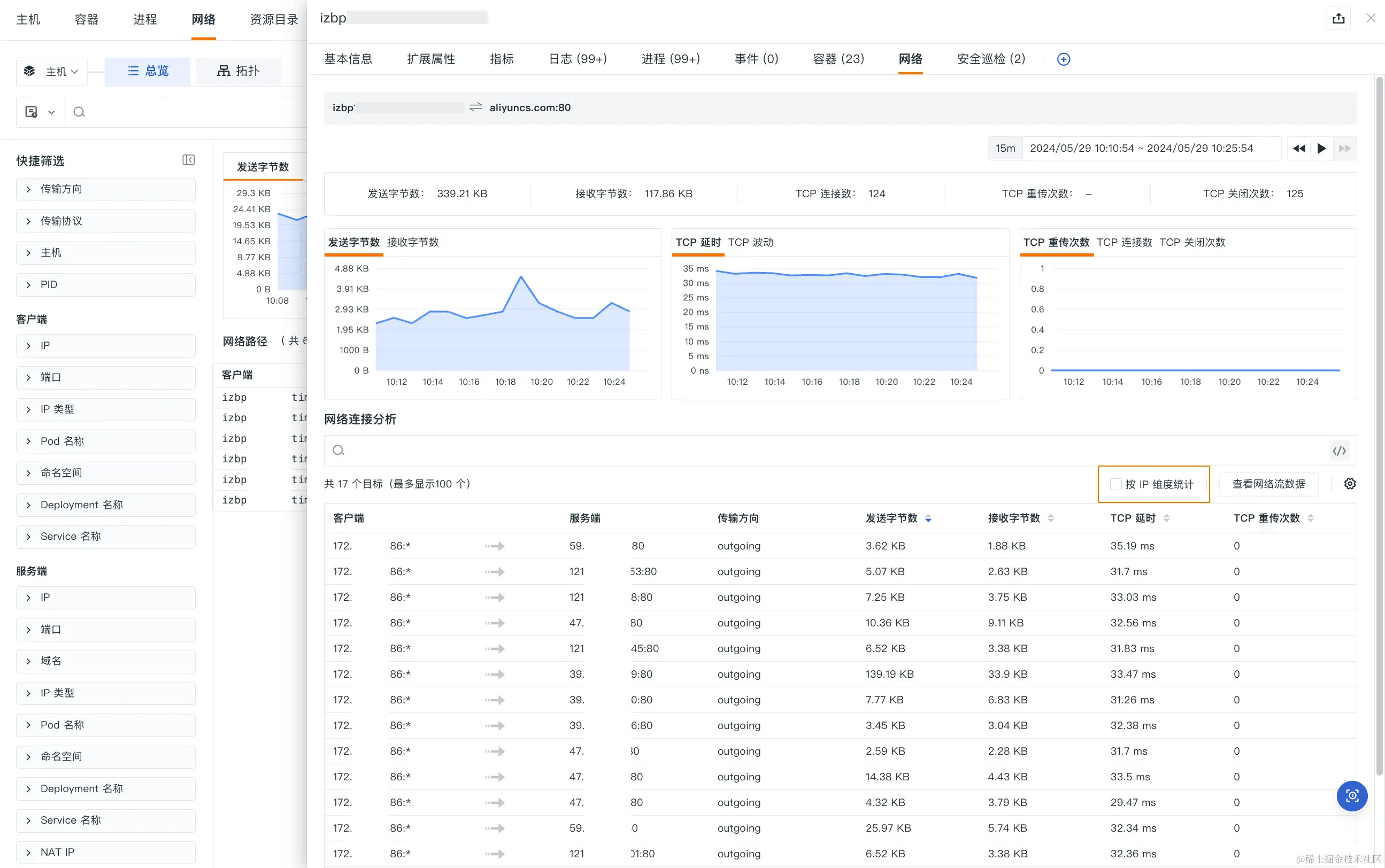 网络详情页 > 网络分析支持 ip:端口 和 ip 两种维度统计列出展示。