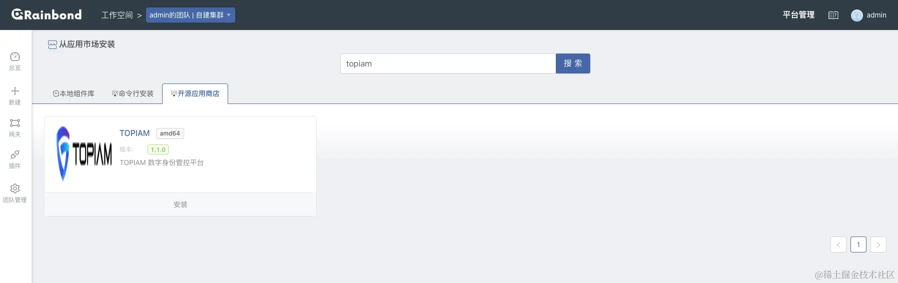 登录 Rainbond 后,选择从应用市场安装应用,在搜索框中搜索 topiam,点击安装按钮。