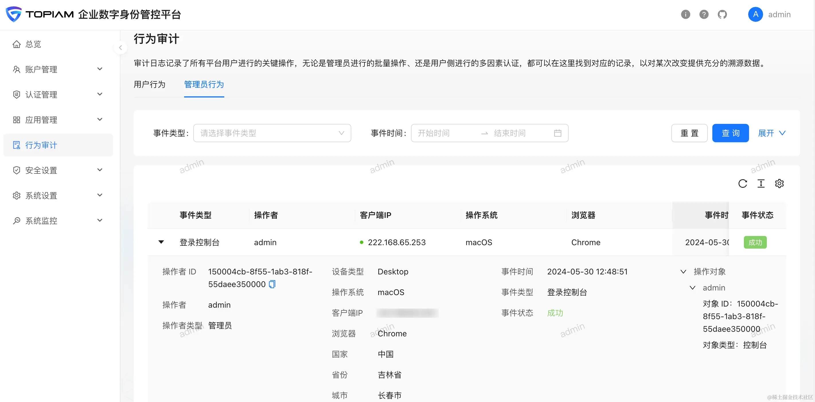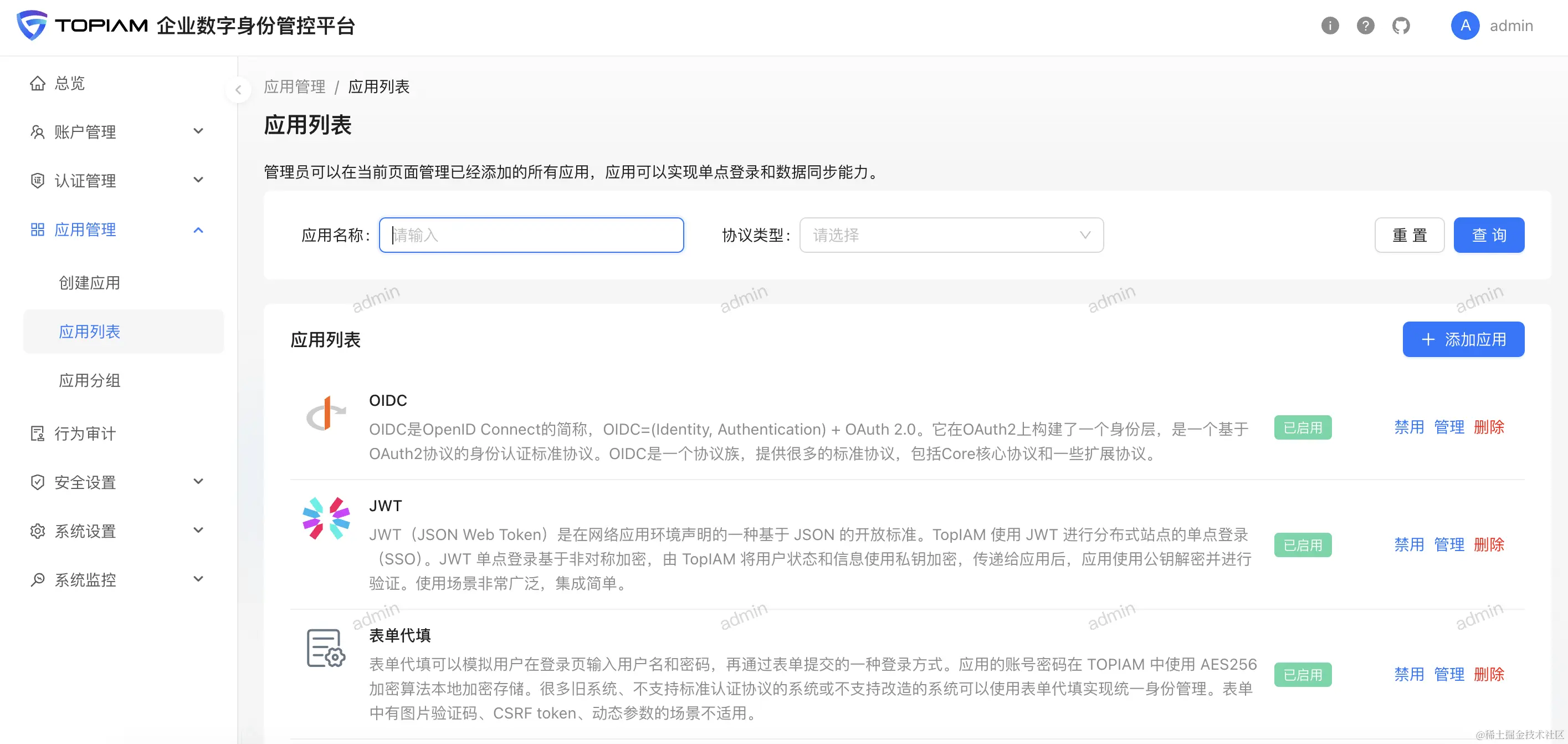 点击访问按钮,访问管理端组件的对外服务地址,默认账号密码 admin/topiam.cn。用户端登录需要在管理端中创建账号再登录,更多请参阅TOPIAM文档。