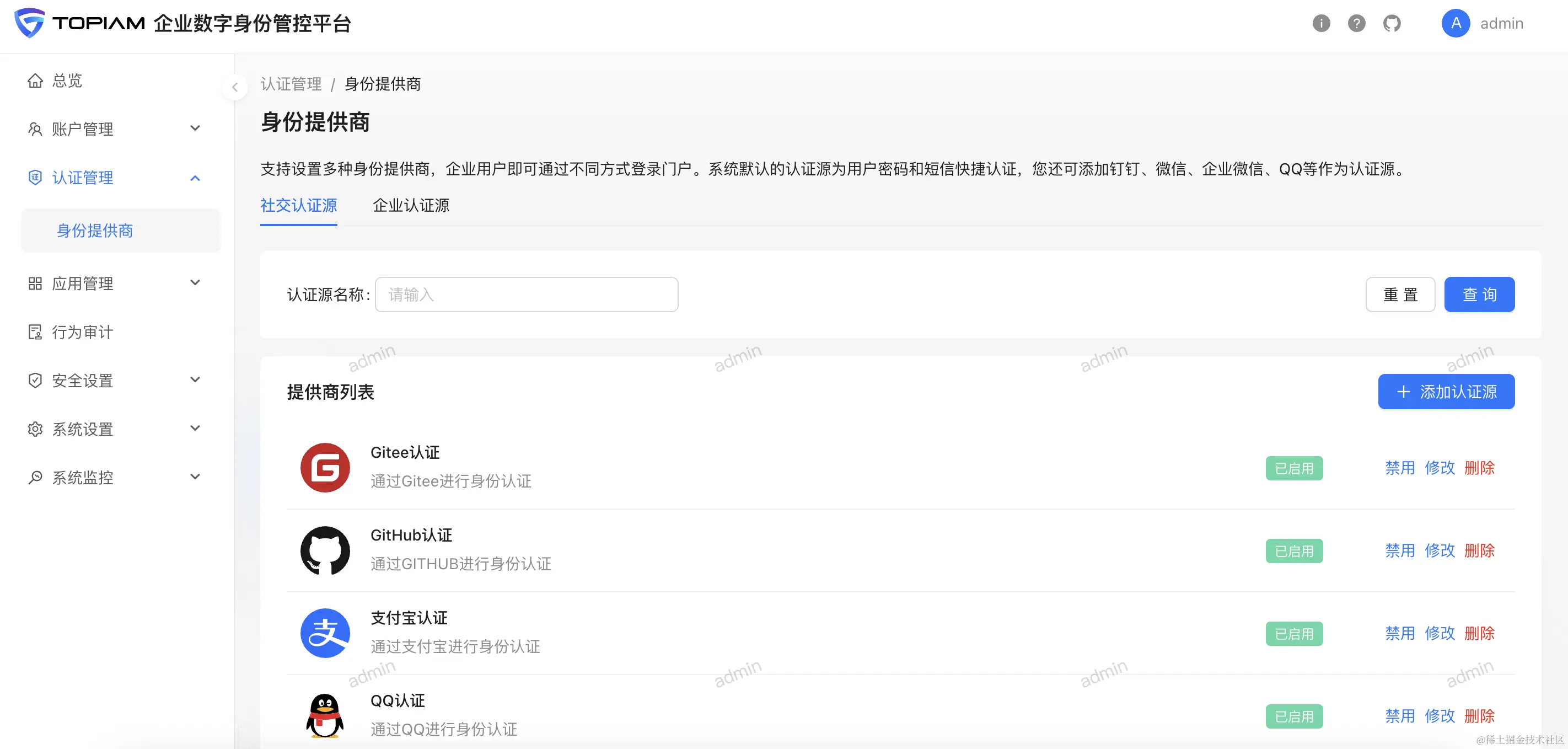 TOPIAM 企业数字身份管控平台, 是一个开源的IDaas/IAM平台、用于管理账号、权限、身份认证、应用访问,帮助整合部署在本地或云端的内部办公系统、业务系统及三方 SaaS 系统的所有身份,实现一个账号打通所有应用的服务。
