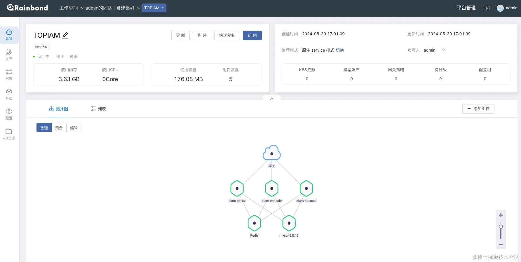 点击安装后,等待 TOPIAM 所有组件自动启动,部署后拓扑图如下:
