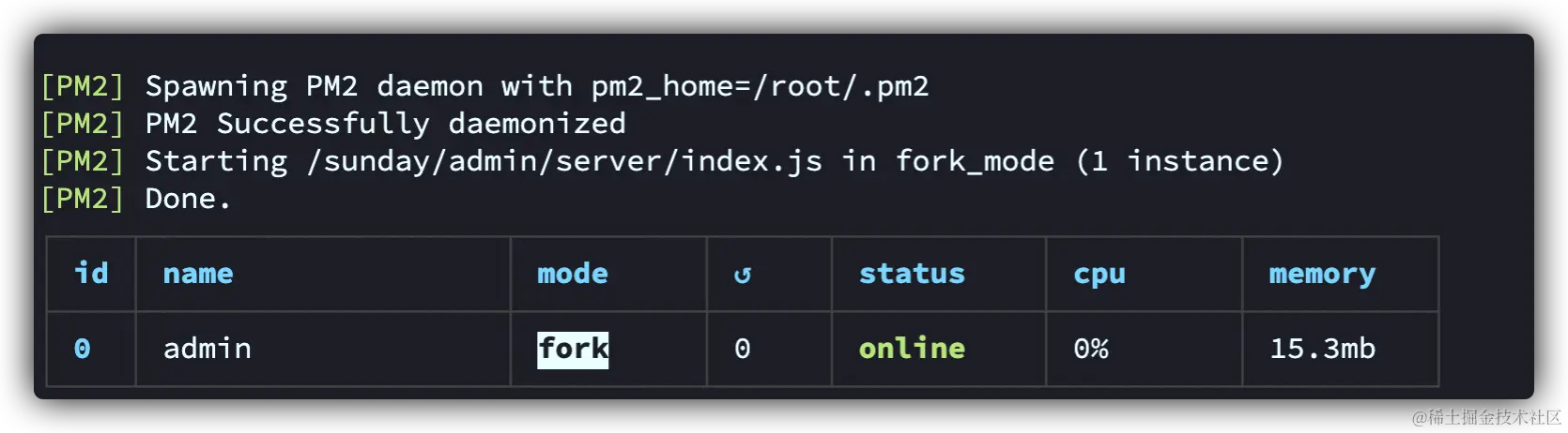 安装成功之后,在项目目录中,直接 pm2 start index.js --name="admin" 即可