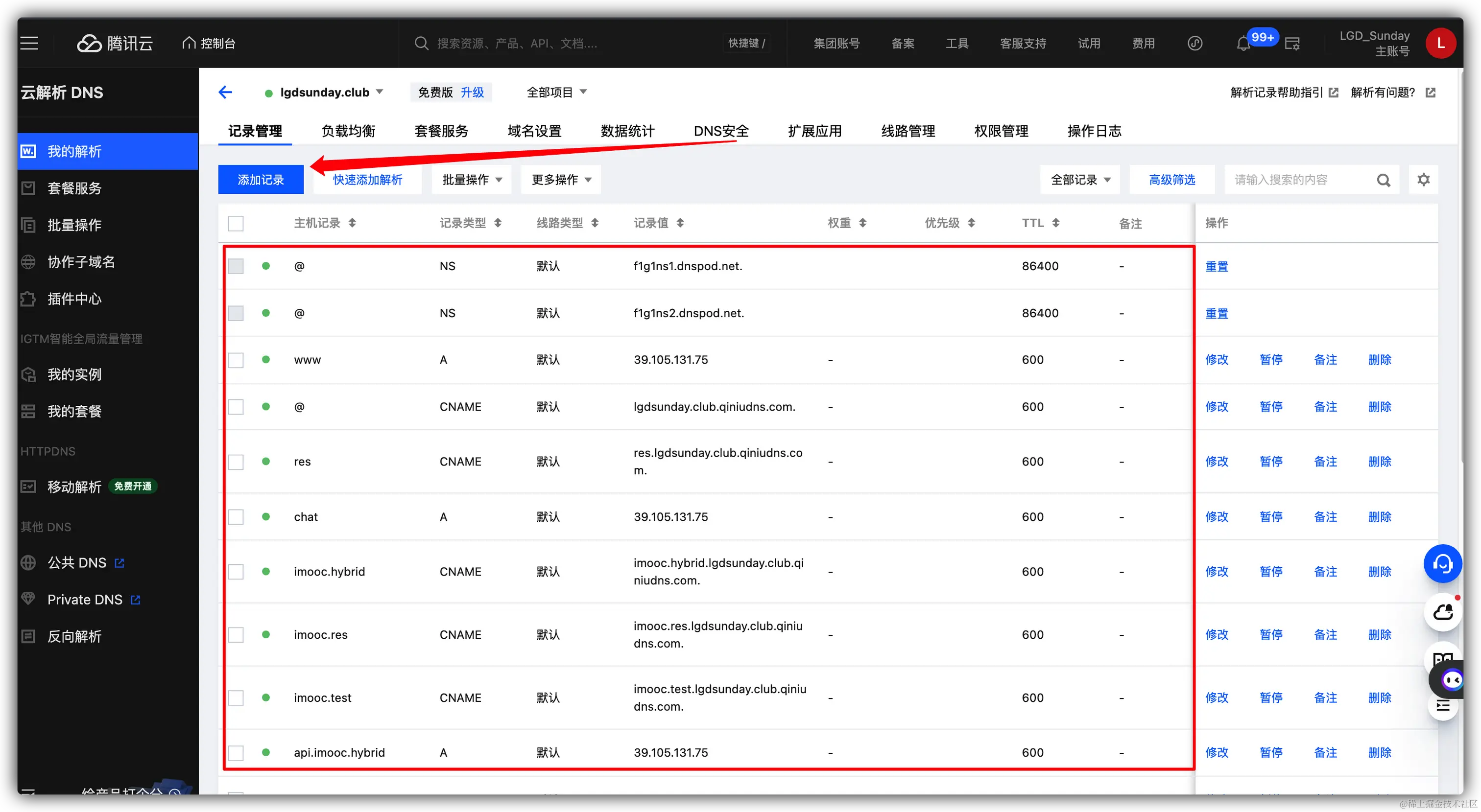 点击左上角的 添加记录 就可以新增一条解析。其中 每一条解析大家可以理解为是一个服务的访问路径。