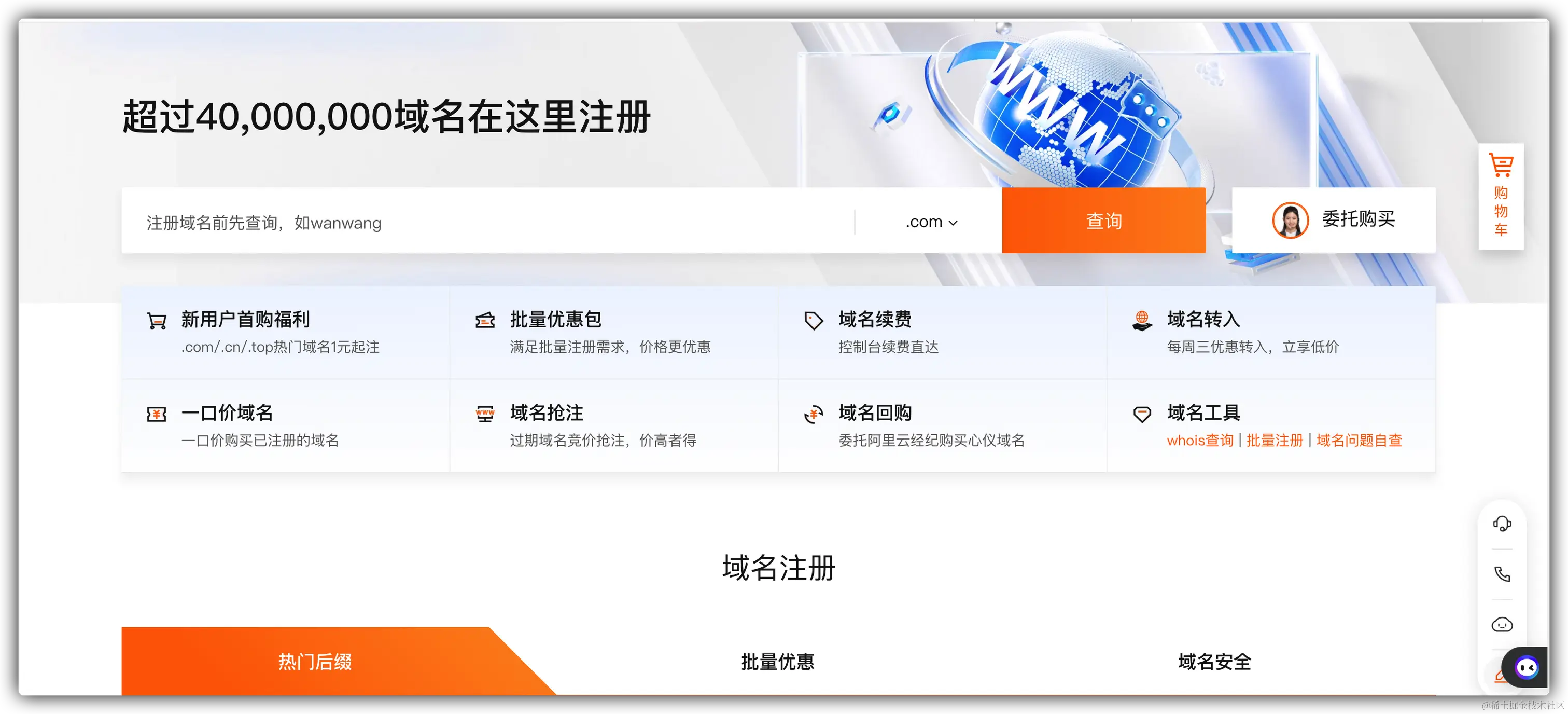 国内无论是 阿里云 还是 腾讯云 都提供了域名的购买。我们还是以 阿里云 为例: