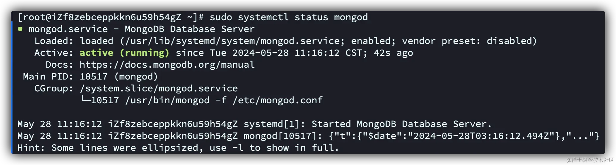 sudo systemctl status mongod打印如下内容,证明运行成功