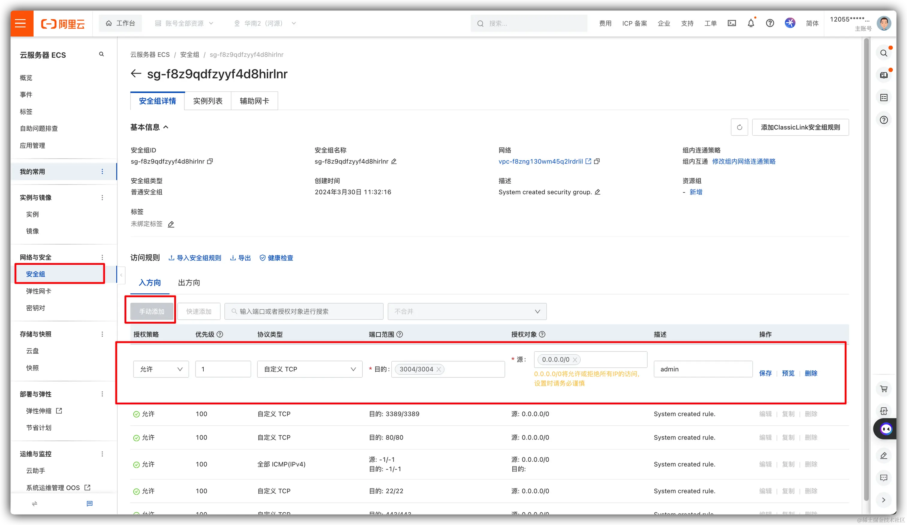所以需要到 阿里云服务器控制台 找到 安全组配置 进行 端口配置