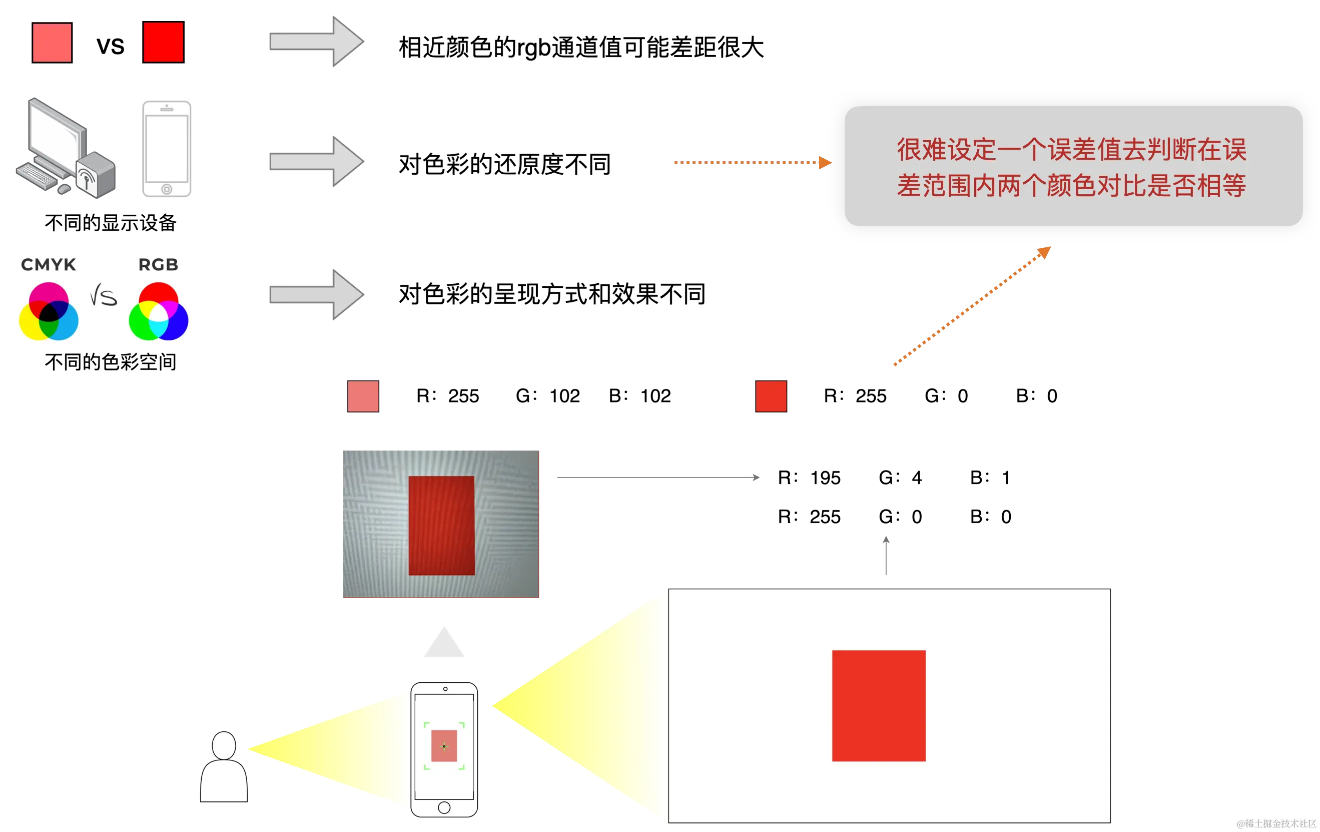 以上颜色对比的方法有一个问题,相近颜色的r、g、b通道值有时差距很大,比如:#FF0000(rgba(255, 0, 0, 255))和#FF6666(rgba(255, 102, 102, 255))的g、b通道差值为102,但颜色很接近,容易产生错误判断,且还可能受到环境光,显示设备对色彩的还原度等等因素的影响,导致我们很难去设定一个误差值判断在误差范围内两个颜色对比是否相等