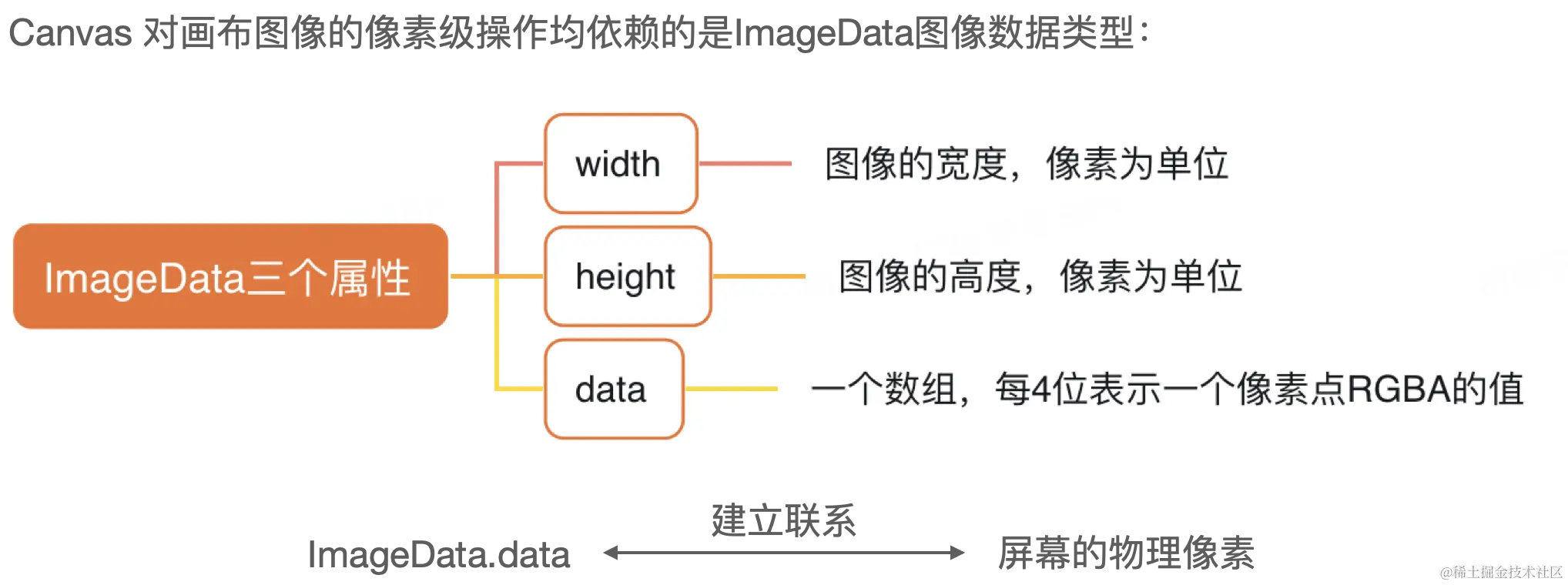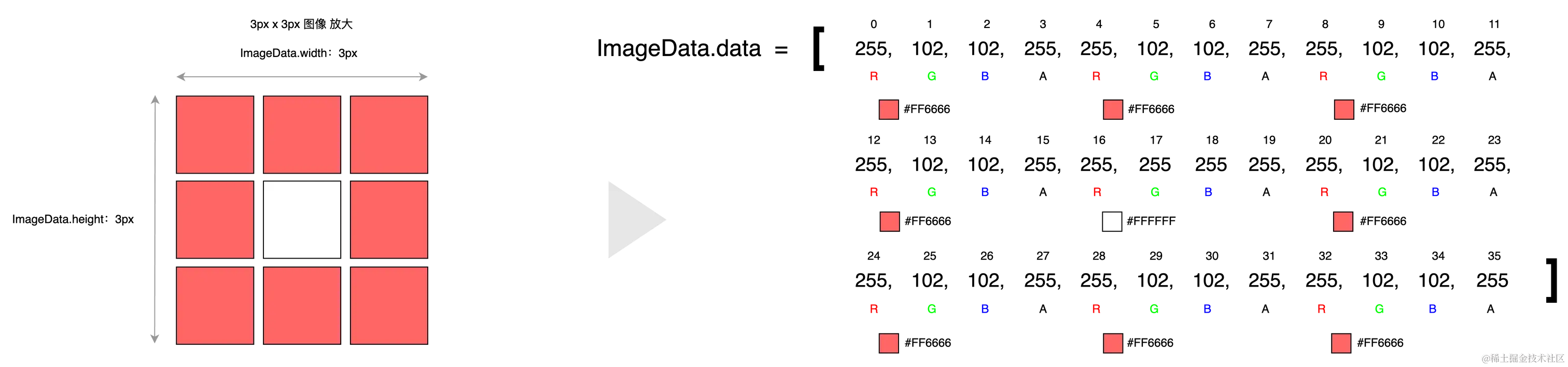 下图展示了3px*3px红色边框正方形Canvas画布 ImageData数据与图像像素的关系,根据行(x)、列(y)读取某像素点的 R/G/B/A 值的公式为:imageData.data[((point.y * (imageData.width * 4)) + (point.x * 4)) + 0/1/2/3]。