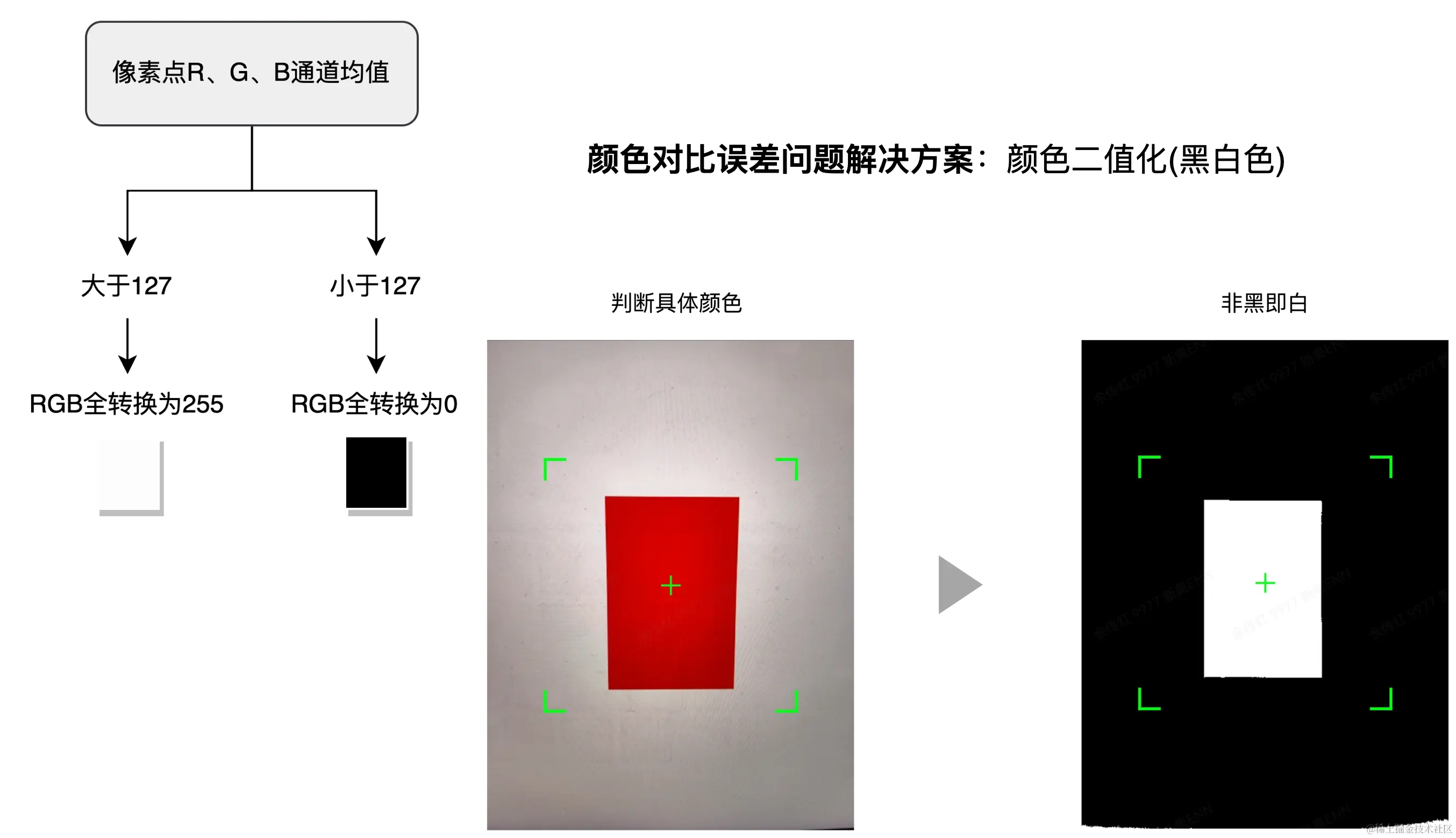 那如何解决这个问题呢?我们是可以预设目标检测色块的颜色甚至背景。所以可以把图片颜色转换成只有2种颜色,也就是二值化,一般采用黑白色搭配。实现逻辑是:扫描图片每个像素,当像素R、G、B通道均值大于127 把像素RGB通道值都转换成255(白色)否则转换成0(黑色),使用127判断是因为它是0-255最中间的值。此方法让上图近似红、拍摄后显示的屏幕红、正红全部变为白色,解决了颜色判断误差问题。