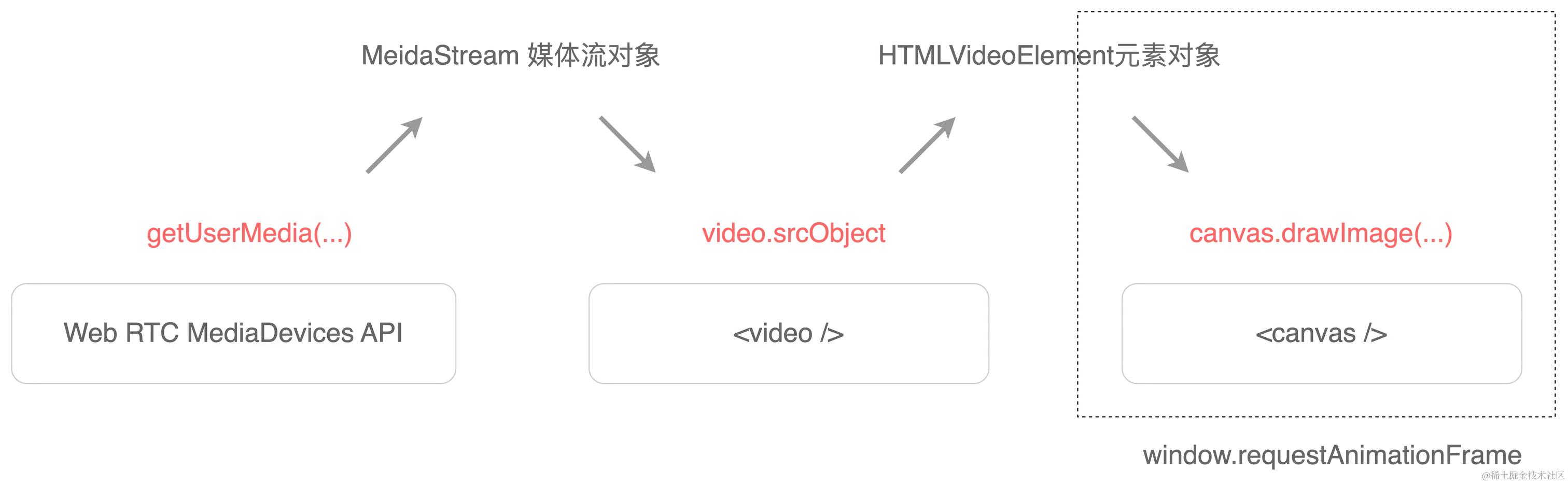 - 调用 Canvas 元素对象 的 drawImage 方法把 HTML Video 元素传入,绘制当前时刻的视频画面,这是把某一时刻或某一帧摄像头捕捉的影像渲染到Canvas元素;