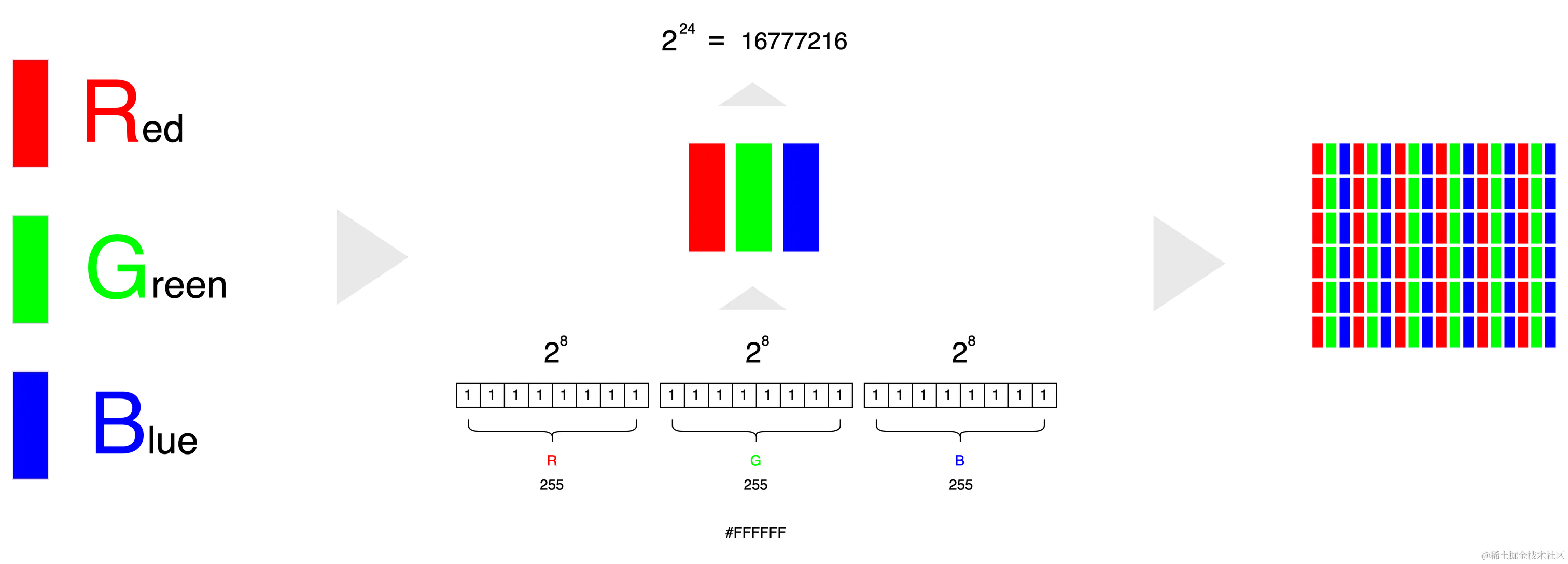 浏览器 HTML Canvas 提供了对画布图像像素级操作的接口,比如:可以通过 Canvas 2D 渲染上下文的createImageData()方法基于图像像素数据绘制画布,getImageData()获取画布当前图片像素数据,putImageData()更新画布图像。操作和依赖的是ImageData图像数据类型,ImageData提供了3个属性,ImageData.width、ImageData.height、ImageData.data, 其中ImageData.data为8位无符号整型固定数组类型,数组项值只能为0到255区间的无符号整型构成。数组每4位表示一个像素RGBA的值,RGBA是一种色彩空间模型,由RGB色彩空间和Alpha通道组成,其中RGB负责颜色显示,Alpha通道表示不透明度,RGB色彩空间是基于三原色光模式也叫RGB色彩模型或红绿蓝颜色模型,现在彩色显示器都应用了三原色光加色技术,一个物理像素由3个子像素构成,分别负责显示红、绿、蓝不同强度的原色光,人眼会基于此3色叠加产生一个生理感知色。下图举了一个白色像素的示例说明RGB色彩模型。