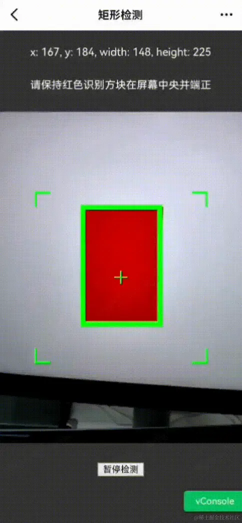 最终选择方法3,只检测画面中心点像素。当然这个方法需要用户保证红色矩形色块区域能覆盖画面中心像素点,可以为拍摄画面增加辅助标记及提示,类似于相机的对焦瞄准框,引导用户便捷地完成此操作。
