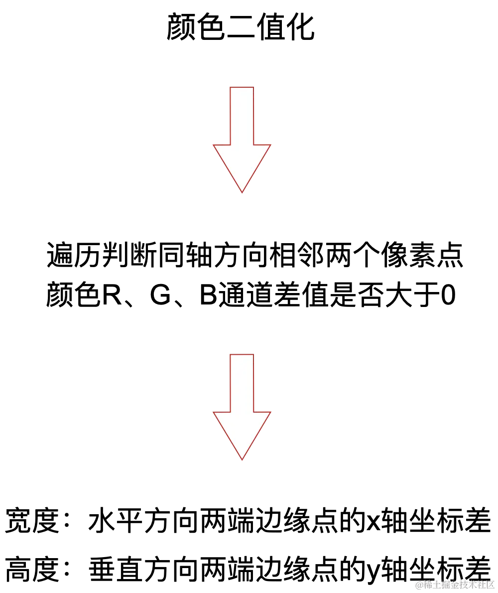 当找到红色矩形色块中的某个像素点后,就可以基于此像素点的x轴水平方向两端,y轴垂直方向两端做边缘检测,颜色比对二值化解决颜色误差后,具体逻辑就变成判断同轴方向相邻两个像素点颜色R、G、B通道差值是否大于0。水平方向两端边缘点的x轴坐标差等于矩形的宽度,垂直方向两端边缘点y轴坐标差等于矩形的高度,左边缘点x,上边缘点y为红色矩形色块的左顶位置坐标。