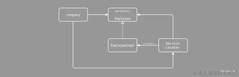从类图中可以看出,服务定位与依赖注入的区别在于,服务定位只是将控制权从注入器转移到了服务定位器中。在依赖注入中,Company