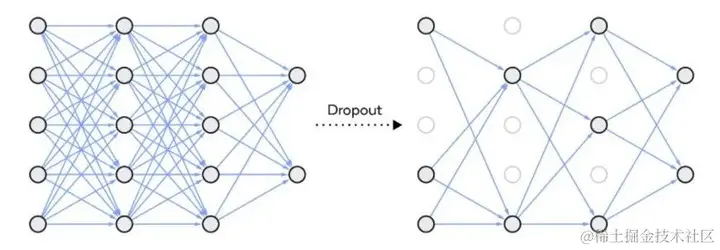 Dropout 是一种在神经网络中使用的正则化技术,它通过随机地停用一些神经网络单元来工作。这种技术可以应用于网络中的任意隐藏层或输入层,但通常不应用于输出层。Dropout 的作用是减少神经元之间的相互依赖,促使网络学习到更加独立的特征表示。通过这种方式,Dropout 有助于降低模型的复杂度,防止过拟合,如下面的图表所示。