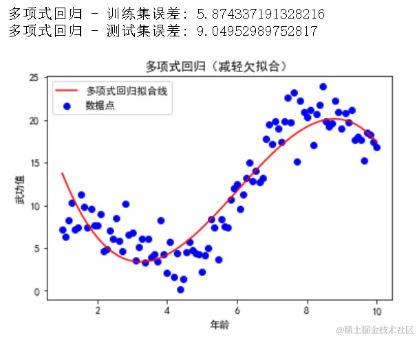 - 适度拟合(橙色线):三阶多项式回归模型能够较好地捕捉数据中的规律,同时在训练集和测试集上都有较好的表现。