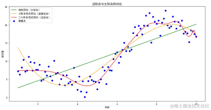- 过拟合(红色线):二十阶多项式回归模型虽然在训练集上表现非常好,但在测试集上表现很差。模型过于复杂,倾向于记住训练数据中的噪声和细节。