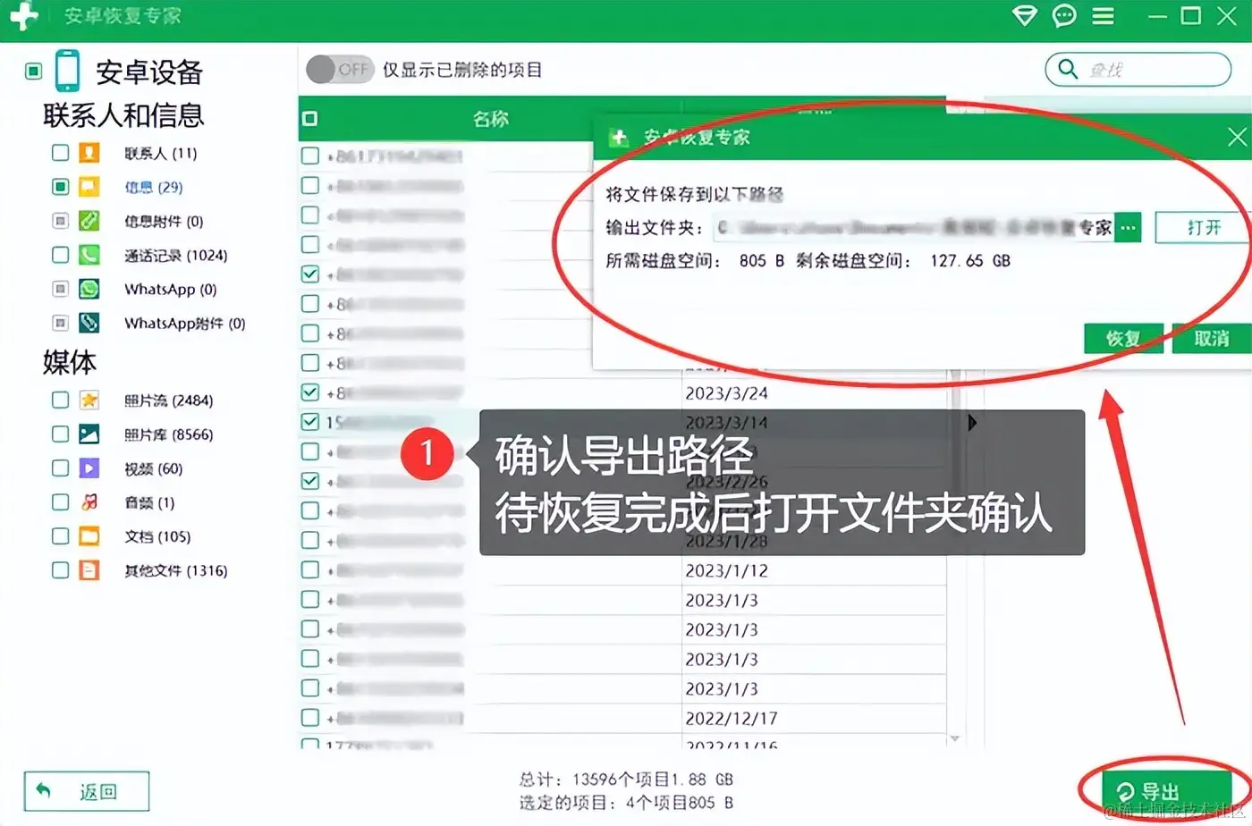第三步:扫描完成之后,它将为我们列出所有可恢复的文件,我们在左框点击数据类型后,在列表中查看并选择,确认之后点击右下角的导出键,并在弹出的选择框中确认恢复位置,这些被选中的数据就能被下载到电脑中。