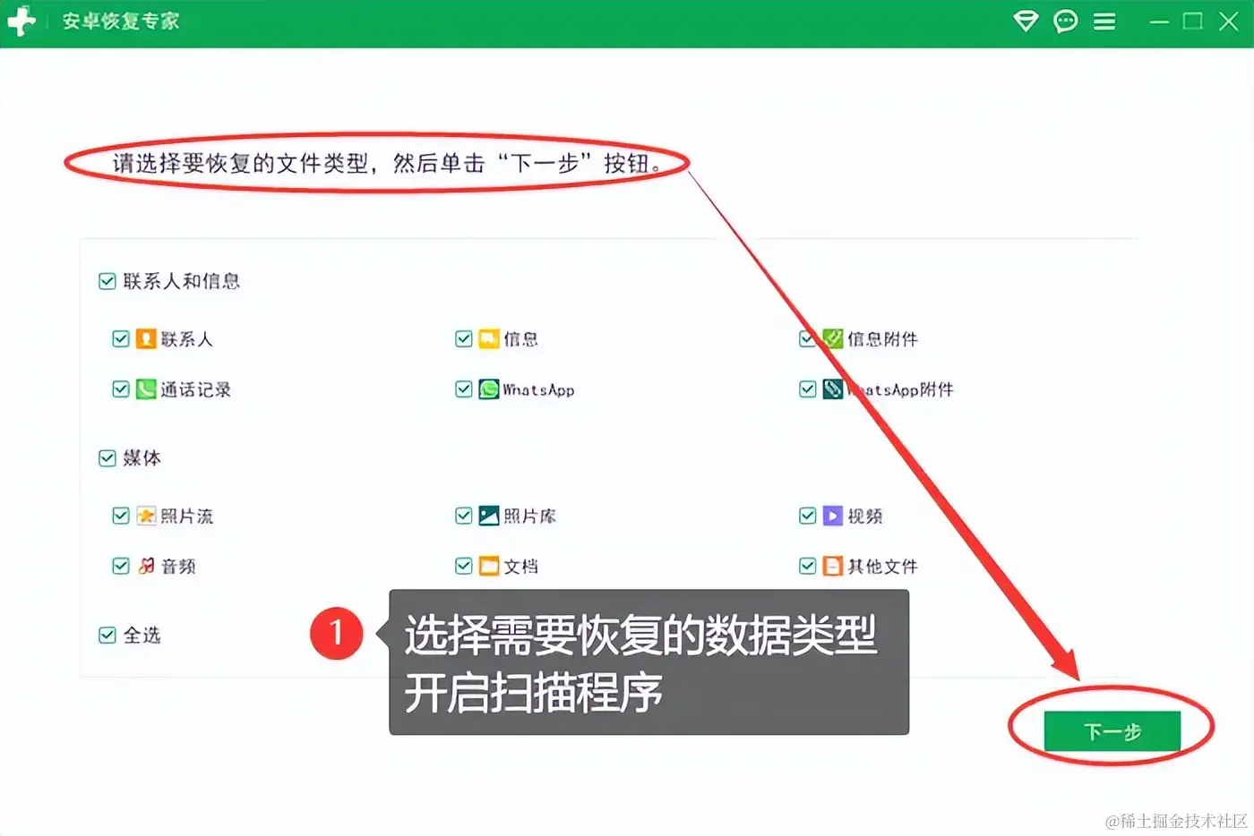 第二步:在连接成功后,我们需要将自己需要恢复的数据进行选择,例如联系人、短信等,然后点击下一步,开启扫描。扫描的过程需要一定时间,这根据手机数据的大小而定,因此精准选择文件类型可缩短扫描时间。