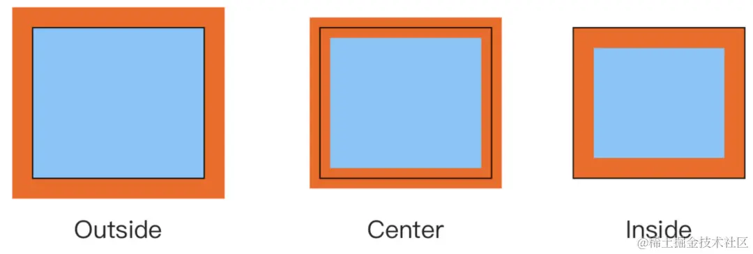 我必须说实话,这些矩形本身的尺寸完全一致,你的眼睛被成功欺骗了。在设计工具中创建的这些矩形具有相同的描边宽度、颜色和端点属性。那么是什么导致了这种视觉错觉呢?为什么在 SVG 图形中似乎从未遇到过这种情况呢?答案很简单,这些矩形有且仅有一个特性不同:描边位置。