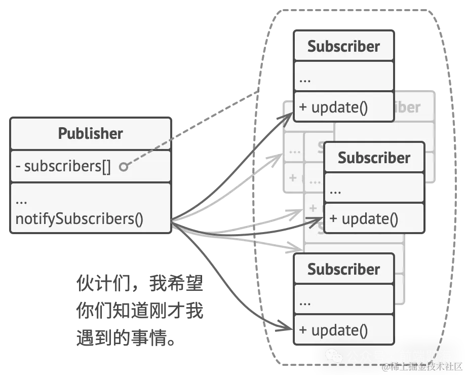 **「观察者模式」**是一种行为设计模式, 允许你定义一种订阅机制, 可在对象事件发生时通知多个 “观察” 该对象的其他对象。