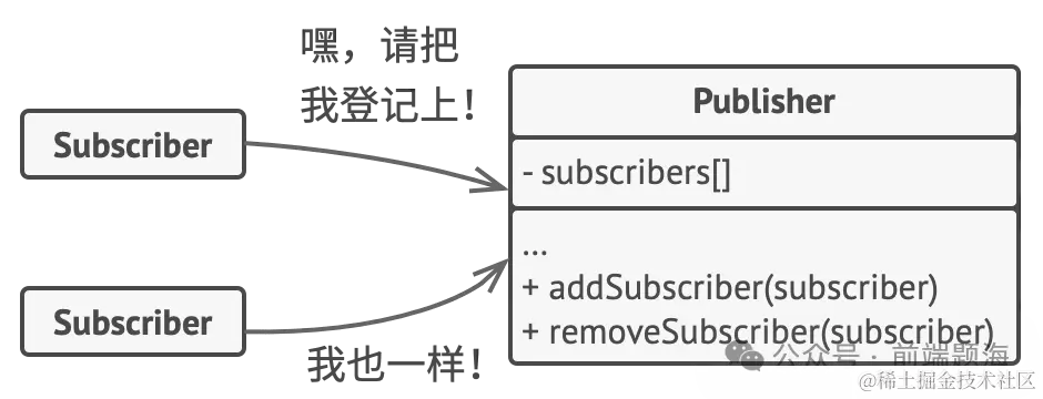 观察者模式建议你为发布者类添加订阅机制, 让每个对象都能订阅或取消订阅发布者事件流。 不要害怕! 这并不像听上去那么复杂。 实际上, 该机制包括